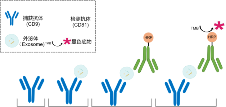 本產品是基于ELISA夾心法用于外泌體定性定量的檢測試劑盒,利用高性能CD9捕獲抗體和CD81檢測抗體可以靈敏地檢測共表達外泌體表面標記的CD9和CD81靶標。本產品可適用于人體體液、細胞培養(yǎng)液等多種樣本,能夠實現對原始樣本中的外泌體進行快速精準定量。