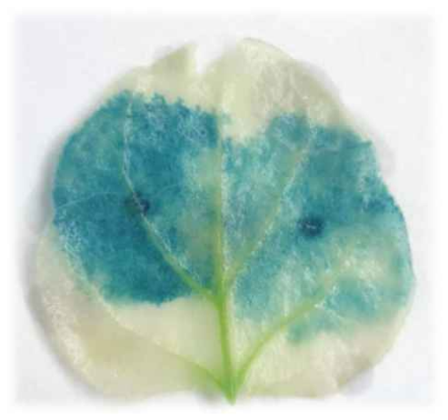 3.洗脫:將材料轉(zhuǎn)入無水乙醇或80%丙酮中脫色2-3次,至陰性對(duì)照材料為白色。GUS染色陽性的藍(lán)色斑點(diǎn)很穩(wěn)定,在酒精中不褪色。