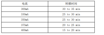 推薦使用恒流轉移,電流可設置350-400mA,轉膜液中離子成分較多,可以承受大電流,并且發(fā)熱量較低。