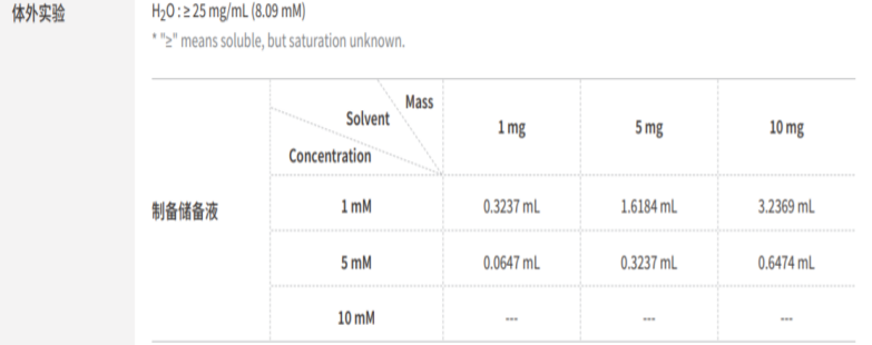 請(qǐng)根據(jù)產(chǎn)品在不同溶劑中的溶解度選擇合適的溶劑配制儲(chǔ)備液;?旦配成溶液,請(qǐng)分裝保存,避免反復(fù)凍融造成的產(chǎn)品失效。儲(chǔ)備液的保存?式和期限:-80°C, 6 months; -20°C, 1 month (sealed storage, away from moisture)。-80°C 儲(chǔ)存時(shí),請(qǐng)?jiān)?6 個(gè)?內(nèi)使?,-20°C 儲(chǔ)存時(shí),請(qǐng)?jiān)?1 個(gè)?內(nèi)使?。