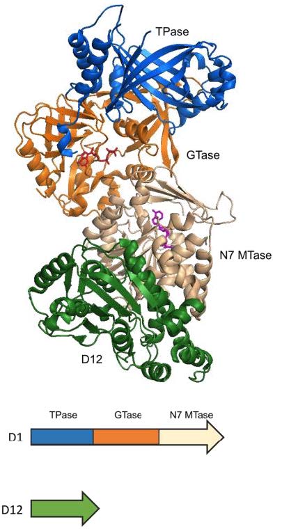 圖1. 牛痘病毒加帽的結(jié)構(gòu)和作用機理。a. 牛痘病毒加帽酶和 GTP(紅色)、SAH(玫紅)的共結(jié)晶結(jié)構(gòu) (PDB 4CKB) 。該酶由 D1 和 D12 兩個亞基組成,兼具RNA 三磷酸酶(藍色)、鳥苷轉(zhuǎn)移酶(橙色)和鳥嘌呤甲基轉(zhuǎn)移酶(米黃色)的功能。本圖引自 Ramanathan, A., Robb, G. B., & Chan, S. H. (2016). mRNA capping: biological functions and applications. Nucleic Acids Res 44(16), 7511–7526. b. mRNA 的帽結(jié)構(gòu)是由一個 7-甲基鳥苷通過一個5′–5′三磷酸酯橋連接到mRNA 鏈的5′核苷上組成。Cap-0 結(jié)構(gòu)由相鄰的 RNA 鏈通過三種酶的依次反應(yīng)形成。進一步形成 cap-1 結(jié)構(gòu)需要2’-O-甲基轉(zhuǎn)移酶的參與,該修飾可以降低 RNA 在體內(nèi)引起的細胞先天免疫反應(yīng)。本圖引自 Decroly, E., Ferron, F., Lescar, J. et al. (2012). Conventional and unconventional mechanisms for capping viral mRNA. Nat Rev Microbiol 10, 51–65。