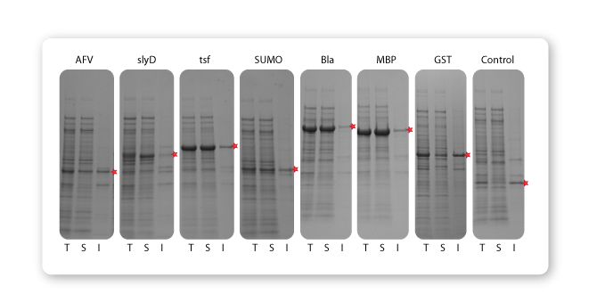 Figure 2. GH1 (Human Growth Hormone) was evaluated for E. coli expression and solubility when expressed as a fusion. Fusion tags SlyD, Tsf, SUMO, Bla, and MBP demonstrated enhanced solubility (Lane S) compared to the His-control protein. T: Total Lysate, S: Cleared Soluble Fraction, I: Insoluble Pellet