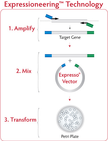 The Expresso Rhamnose Cloning and Protein Expression Systems are designed for fast, easy, and efficient directional cloning and expression of PCR-amplified genes using Expressioneering Technology. Expressioneering Technology uses in vivo homologous recombination to seamlessly clone PCR amplified DNA into specially designed expression vectors without the need for enzymes or purification steps. A single host strain is used for both stable cloning and controlled protein expression, making Expresso Rhamnose the fastest cloning and expression systems available. The systems come complete with pre-processed expression plasmids and competent cells, supplied in single transformation vials.