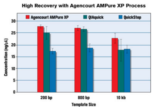 Agencourt AMPure XP可以結(jié)合大于100bp的核酸片段,對(duì)于片段長(zhǎng)度為10KB的長(zhǎng)片段,也能獲得比傳統(tǒng)過(guò)柱法高得多的得率。