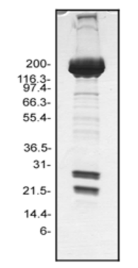 Cardiac myosin protein has been purified from bovine heart muscle. The full length myosin protein has been purified with its essential light chains (ELC) and regulatory light chains (RLC), see Figure 1 and 2. Cardiac myosin has been determined to be biologically active in an F-actin activated ATPase assay, but it is not recommended for use in motility assays because of auto-inhibition (Protease digests with alpha-chymotrypsin and papain may create a subfragment that has F-actin moving properties. Cardiac myosin protein is supplied as a white lyophilized powder. When reconstituted in nanopure water, the protein will be in the following buffer: 100