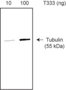 Figure 1: Purity determination of biotin tubulin. 10 and 100 ng of T333P was run on a 4-20% SDS-PAGE gel, transferred to a nitrocellulose membrane and biotin labeled material was detected with streptavidin alkaline phosphatase.
