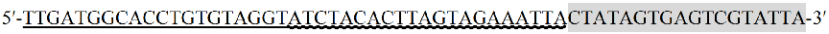 其中灰色部分表示 T7 Promoter 反向互補(bǔ)序列,波浪線部分為 Cas12a DR 反向互補(bǔ)序列,兩者均為固定序列。下劃線部分為 Target Sequence。