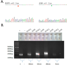 文章中,作者比較了在PCR,測(cè)序以及ARSP在非小細(xì)胞肺癌中EGFR突變檢測(cè)應(yīng)用,發(fā)現(xiàn)在非小細(xì)胞肺癌細(xì)胞系中,5分鐘便能檢測(cè)到EGFR 19Del(2)缺失突變,10分鐘檢測(cè)EGFRL SNP 突變,實(shí)現(xiàn)肉眼快速判斷(圖1),并在組織樣本中同樣得到驗(yàn)證(圖2)。
