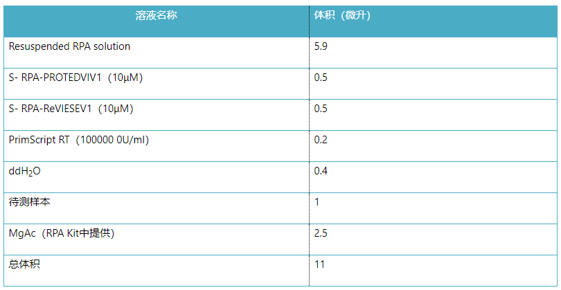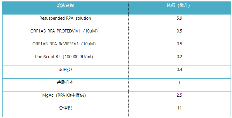 1、為了測試每個(gè)樣品,設(shè)置兩個(gè)RPA反應(yīng),分別檢測S基因靶標(biāo)和Orf1ab靶標(biāo)。此外,可以使用合成病毒片段建立S基因和Orf1ab的陽性對照。還應(yīng)建立不添加測試樣品的陰性對照。使用RPA試劑盒中提供的29.5ul的Rehydration Buffer重懸每個(gè)凍干的RPA沉淀。