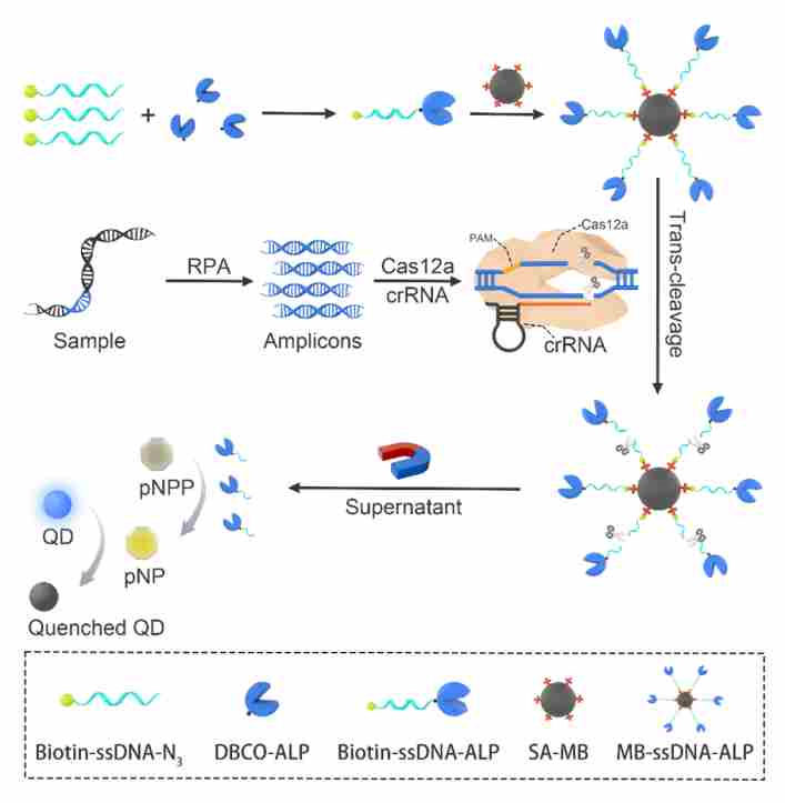 本研究開發(fā)了一種結(jié)合RPA、CRISPR/Cas12a和磁珠-酶新型報(bào)告系統(tǒng),用于ASFV基因的快速精準(zhǔn)診斷的方法。如圖1所示,biotin-ssDNA-azide與DBCO修飾的堿性磷酸酶(ALP)通過點(diǎn)擊化學(xué)反應(yīng)合成biotin-ssDNA-ALP,biotin-ssDNA-ALP與鏈霉親和素修飾的磁珠(SA-MB)結(jié)合獲得MB-ssDNA-ALP報(bào)告系統(tǒng)。用RPA擴(kuò)增ASFV基因序列,獲得擴(kuò)增子,擴(kuò)增子與Cas12a-crRNA復(fù)合物結(jié)合,激活Cas12a反式切割活性,切割MB-ssDNA-ALP上的ssDNA,釋放ALP;ALP催化pNPP水解生成pNP,引起比色信號(hào)變化,再加入量子點(diǎn)作為熒光報(bào)告子,實(shí)現(xiàn)比色和熒光的雙模式信號(hào)輸出。