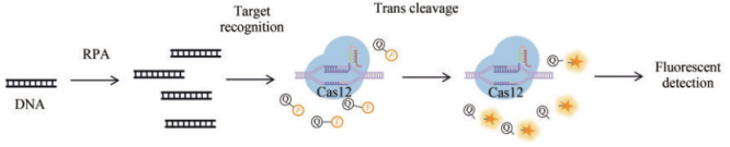廣泛應用于核酸檢測的三種Cas12a蛋白包括LbCas12a、AsCas12a和FnCas12a,其中LbCas12a的反式切割活性最強。2017年Jennifer Doudna團隊開發(fā)了DETECTR(DNA endonuclease-targeted CRISPR trans reporter)檢測技術,利用LbCas12a(Lachnospiraceae bacterium ND2006)與crRNA復合物,并在crRNA引導下利用RuvC結構域切割PAM(TTTN)序列下游18~25nt的靶DNA,在識別并切割靶標dsDNA的同時,激發(fā)Cas12a的反式切割活性,切割反應體系中的ssDNA報告分子。ssDNA報告分子標記有熒光基團和猝滅基團,一旦切割,熒光基團和猝滅基團被分離,就會產生穩(wěn)定而強烈的熒光信號,熒光信號的強度可以指示檢 測樣本中靶標的量。此外,DETECTR還與重組酶聚合酶等溫擴增技術結合(recombinase polymerase amplification,RPA),不僅提高了檢測分析的靈敏度(amol/L水平),而且避免了對復雜、昂貴設備的需求。該技術現(xiàn)已成功應用于人乳頭狀瘤病毒(human papilloma virus,HPV)和SARS-CoV-2的檢測。