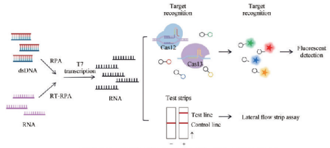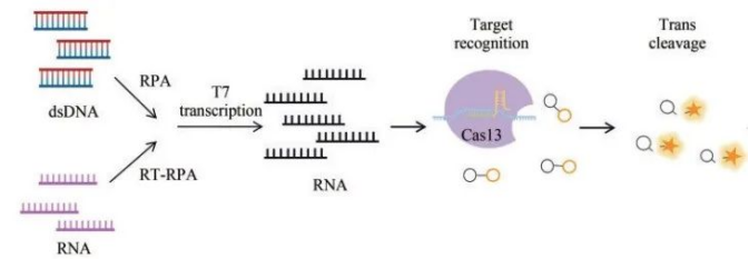 Cas13是RNA引導和RNA靶向的核酸酶,具有兩個HEPN結構域,特異性作用于RNA靶標。2017年,張峰團隊開發(fā)了SHERLOCK(specific high-sensitivity enzymatic reporter unlocking)核酸檢測技術。該技術與DETECTR原理相同,但依賴于LwaCas13a(Leptotirichia wadei)核酸酶的活性,識別和切割靶標RNA的同時,反式切割ssDNA報告分子產生熒光信號。