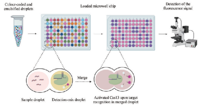 2020年,ACKERMAN等聯(lián)合CRISPR診斷和微流控技術開發(fā)了CARMEN(combinatorial arrayed reactions for multiplexed evaluation of nucleic acids)檢測平臺,該技術可以同時檢測8個樣本,169種人類相關病毒。但由于芯片定制成本高和檢驗操作流程復制,很難應用于臨床。該團隊在CARMENv.1的基礎上開發(fā)了mCARMEN(microfluidic combinatorial arrayed reactions for multiplexed evaluation of nucleic acids),將CRISPR診斷、微陣列技術與簡化的臨床工作流程相結合,開發(fā)的mCARMEN呼吸道病毒檢測面板,可同時檢測21種呼吸道病毒,包括SARS-CoV-2及其他冠狀病毒、流感病毒等。