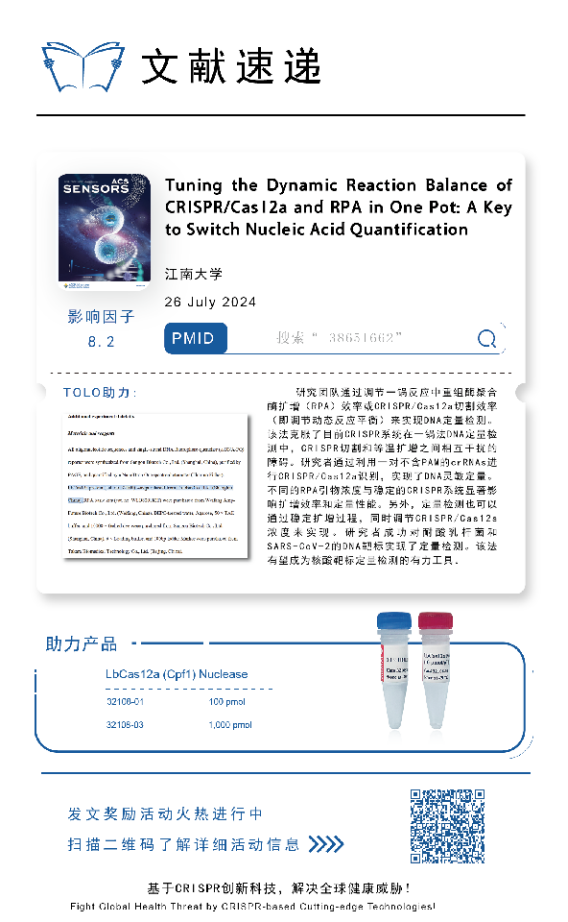 近期,江南大學生物工程學院徐巖教授團隊吳群教授課題組在新型微生物定量檢測技術的開發(fā)中取得了重要進展,研究成果“Tuning the Dynamic Reaction Balance of CRISPR/Cas12a and RPA in One Pot: A Key to Switch Nucleic Acid Quantification”以主封面文章形式正式發(fā)表于《ACS Sensors》雜志(IF:8.9)(https://doi.org/10.1021/acssensors.3c02485)。