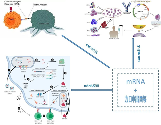 隨著mRNA在醫(yī)學(xué)領(lǐng)域的研究和應(yīng)用不斷拓展,其應(yīng)用越來(lái)越廣闊。其中,在CAR-T細(xì)胞治療、CAR-NK技術(shù)、疫苗等領(lǐng)域的研究成為熱點(diǎn)(下圖)。而牛痘病毒加帽酶能給mRNA加帽,大幅提高mRNA的穩(wěn)定性和啟動(dòng)mRNA的翻譯。體外加帽嵌合抗原受體(CAR)的mRNA,在免疫細(xì)胞內(nèi)穩(wěn)定表達(dá),高效識(shí)別癌細(xì)胞。同理,牛痘病毒加帽酶在mRNA疫苗的應(yīng)用中也是對(duì)外源抗原mRNA進(jìn)行加帽,使其在細(xì)胞內(nèi)穩(wěn)定表達(dá)。