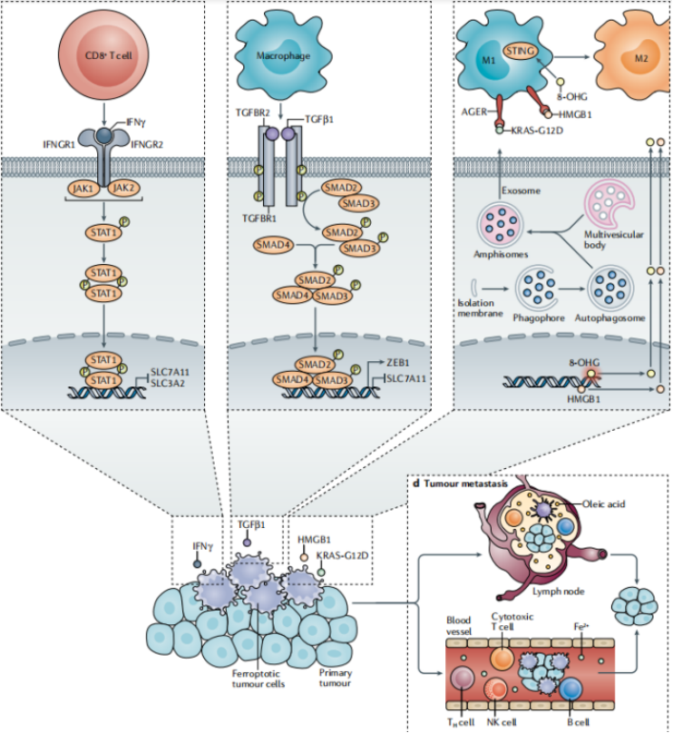 00003. 鐵性腫瘤細(xì)胞釋放損傷相關(guān)分子模式(DAMPs),如高遷移率族蛋白B1(HMGB1)、KRAS-G12D和8-羥基鳥苷(8-OHG),影響腫瘤微環(huán)境中固有免疫細(xì)胞(如巨噬細(xì)胞)的功能。