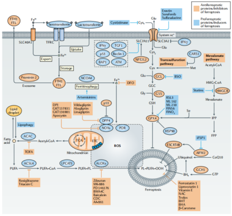 載鐵的血清轉(zhuǎn)鐵蛋白-轉(zhuǎn)鐵蛋白受體(TFRC)復(fù)合物通過(guò)核內(nèi)體內(nèi)化,通過(guò)自然抗性相關(guān)巨噬細(xì)胞蛋白(SLC11A2)釋放鐵(Fe2+)到細(xì)胞質(zhì)中。乳轉(zhuǎn)鐵蛋白和血紅素通過(guò)細(xì)胞膜中不同的攝取途徑提供額外的鐵來(lái)源。Fe2+主要通過(guò)細(xì)胞膜上的溶質(zhì)載體家族(SLC40A1)輸出,但也可以通過(guò)外泌體作為鐵蛋白輸出。鐵死亡在翻譯水平上受鐵調(diào)節(jié)蛋白(IRPs) ACO1和IREB2的調(diào)控。