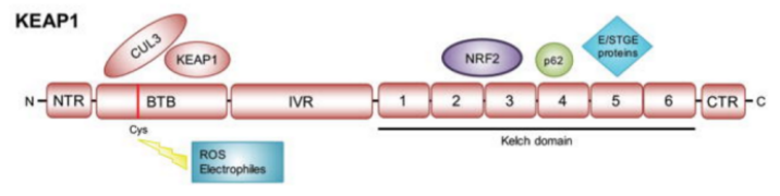 KEAP1由一個(gè)N端結(jié)構(gòu)域(NTR)、一個(gè)Broad-Complex、軌道、bric-à-brac (BTB)結(jié)構(gòu)域、一個(gè)干預(yù)區(qū)(IVR)和六個(gè)與C端結(jié)構(gòu)域(CTR)結(jié)合的Kelch結(jié)構(gòu)域組成,這些結(jié)構(gòu)域與NRF2、p62和其他E/ STGE蛋白相互作用。BTB結(jié)構(gòu)域?qū)τ贙EAP1二聚和與CUL3的相互作用非常重要,它包含一個(gè)半胱氨酸殘基(C151),可以感知活性氧(ROS)和親電試劑。位于其他KEAP1結(jié)構(gòu)域的其他半胱氨酸殘基對(duì)其他刺激有響應(yīng)(未顯示)。