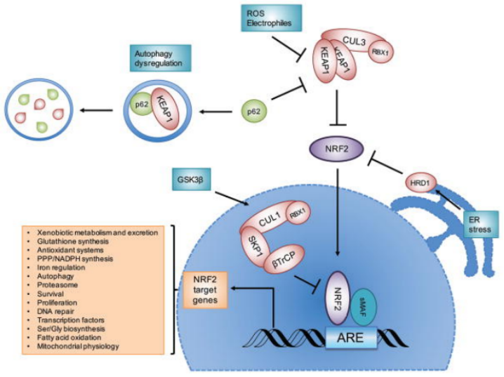 NRF2受E3泛素連接酶復(fù)合物的負(fù)調(diào)控:KEAP1-CUL3-RBX1復(fù)合物、β-TrCP-SKP1-CUL1-RBX1復(fù)合物和HRD1。當(dāng)NRF2蛋白在暴露于活性氧(ROS)、親電試劑或自噬異常調(diào)節(jié)后而升高時(shí),NRF2會(huì)轉(zhuǎn)位到細(xì)胞核,與sMAF蛋白二聚,并與抗氧化反應(yīng)元件(ARE)結(jié)合,激活其靶基因的轉(zhuǎn)錄。圖6指出了NRF2靶基因調(diào)控的一般過(guò)程的例子。