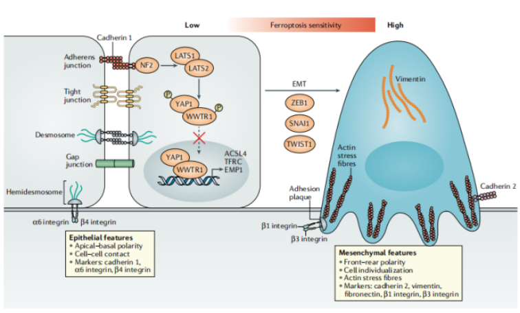 在上皮細(xì)胞中,細(xì)胞-細(xì)胞接觸抑制鐵死亡,部分是通過(guò)鈣粘蛋白1介導(dǎo)的抑制YAP1轉(zhuǎn)錄活性。相比之下,間充質(zhì)狀態(tài)的細(xì)胞由于細(xì)胞-細(xì)胞接觸的缺失和參與上皮-間充質(zhì)轉(zhuǎn)化(EMT)的因子的激活,如ZEB1、SNAI1和TWIST1,容易發(fā)生鐵死亡。