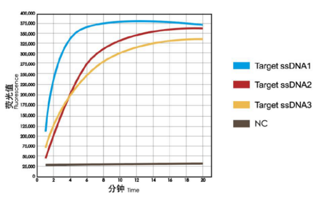· 靶標(biāo)RNA濃度越高,體系反式剪切ssRNA報告探針的速度更快,釋放熒光信號到達(dá)平臺期的時間越短