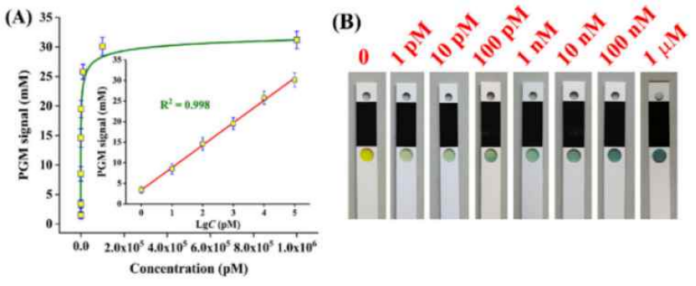 在最佳實(shí)驗(yàn)條件下,研究了Kan濃度與血糖儀讀數(shù)的關(guān)系。如圖4A所示,隨著Kan濃度的增加,血糖儀讀數(shù)逐漸增加。同時(shí)記錄血糖儀試紙條圓形控制窗口的顏色變化情況,隨著Kan濃度的增加,條帶的顏色逐漸由黃色變?yōu)榫G色(圖4B)。與空白樣品相比,1 pM Kan可以產(chǎn)生明顯的顏色變化,這可以定義為傳感系統(tǒng)的檢測(cè)限。如此高的靈敏度可歸因于發(fā)夾DNA的循環(huán)組裝過(guò)程,Cas12a的切割能力以及轉(zhuǎn)化酶的多重轉(zhuǎn)化效率。