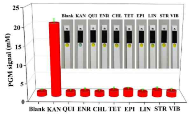卡那霉素(Kan)是一種含有順二醇的氨基糖苷類抗生素,通常用于畜牧業(yè)和水產(chǎn)養(yǎng)殖業(yè)預(yù)防細(xì)菌感染??敲顾卮蠖嘤蓜?dòng)物的腎臟代謝為糖苷并通過(guò)尿液排出,但Kan的濫用導(dǎo)致動(dòng)物源性食品和水樣中存在抗生素殘留,最終可能在人體內(nèi)產(chǎn)生累積,可能會(huì)導(dǎo)致多種嚴(yán)重的副作用(如腎毒性、神經(jīng)毒性、耳毒性和過(guò)敏反應(yīng)),甚至產(chǎn)生抗生素耐藥性。近年來(lái),各種分析技術(shù)已被應(yīng)用于抗生素殘留的靈敏檢測(cè),包括電泳、酶聯(lián)免疫吸附法、熒光法和高效液相色譜法,但是大多數(shù)技術(shù)仍存在操作繁瑣、成本高、操作時(shí)間長(zhǎng)等局限性。因此,需要一種簡(jiǎn)單、快速、超靈敏的抗生素檢測(cè)策略。今年3月,廣東省科學(xué)院生態(tài)環(huán)境與土壤研究所陳俊華等研究人員開(kāi)發(fā)了一種基于血糖儀和CRISPR-Cas12a的卡那霉素(Kan)檢測(cè)方案,該方案具有操作簡(jiǎn)單、成本低、便于大眾使用等優(yōu)點(diǎn),可以實(shí)現(xiàn)現(xiàn)場(chǎng)檢測(cè),堅(jiān)固耐用,可以在資源有限的環(huán)境下實(shí)現(xiàn)抗生素殘留的現(xiàn)場(chǎng)檢測(cè)。其線性范圍為1 pM ~ 100 nM,檢出限為1 pM。