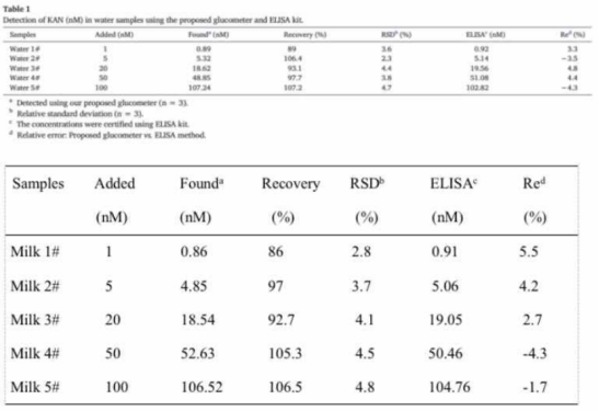 表1. 使用傳感器和ELISA試劑盒檢測(cè)水樣和牛奶中的Kan