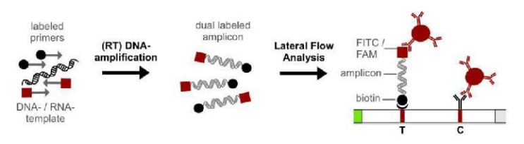 圖2. 標記引物合并到擴增產(chǎn)物中,該產(chǎn)物可在Milenia HybriDetect的測試線(T)上檢測到