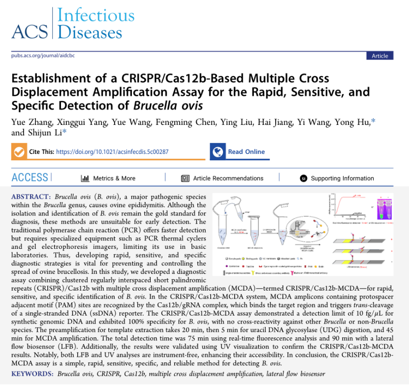 近期,貴州省疾病預(yù)防控制中心在《ACS Publications》發(fā)表重磅研究成果。研究團隊開發(fā)了一種結(jié)合多重交叉置換擴增(MCDA)與CRISPR/Cas12b系統(tǒng)的新型檢測方法,用于快速、靈敏、特異地檢測綿羊布魯氏菌(Brucella ovis),為動物疫病防控及公共衛(wèi)生安全提供了重要技術(shù)支撐。